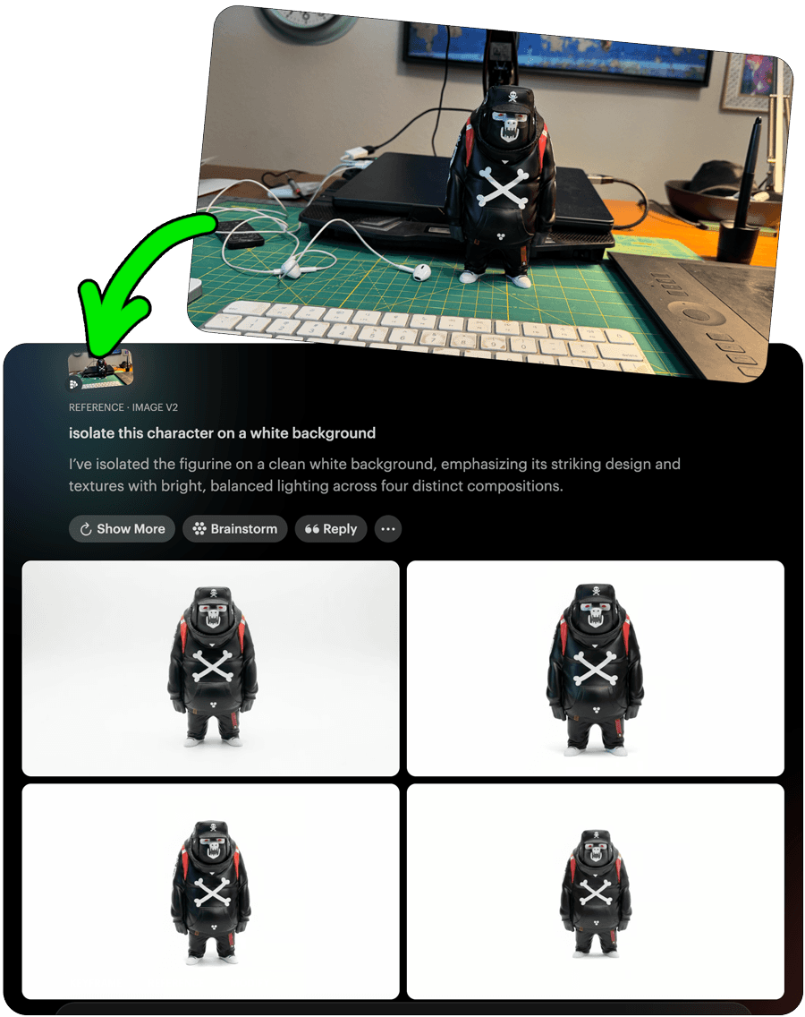 🔑 Tip: I find that it really helps when the subject is alone on a simple background, so, if my character reference image has a busy background, after steps 1️⃣ and 2️⃣, I prompt to "create an image of the character isolated on a white background" or "isolate this character on a white background" and then I drag one of those creations directly into my composer as my new character reference image.