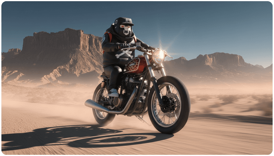 "combine all the images to make the character driving the motorcycle in the desert"