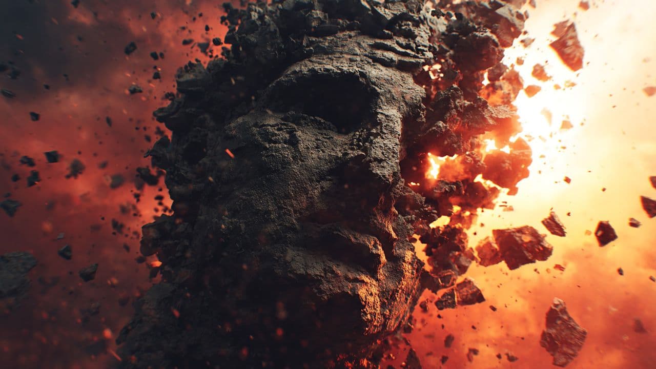 "A massive iceberg dramatically collapses into the ocean. Jagged, blue shards tumble in slow motion, scattering frozen debris. Shimmering light reflects off sharp edges amidst mist and icy spray. "